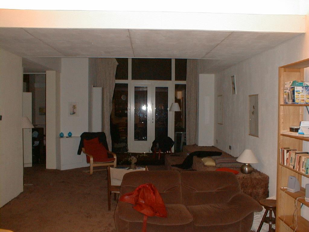 Inside the apartment, facing towards the back. My bedroom can be seen to the left. Note weird steps on the right, behind the couch.